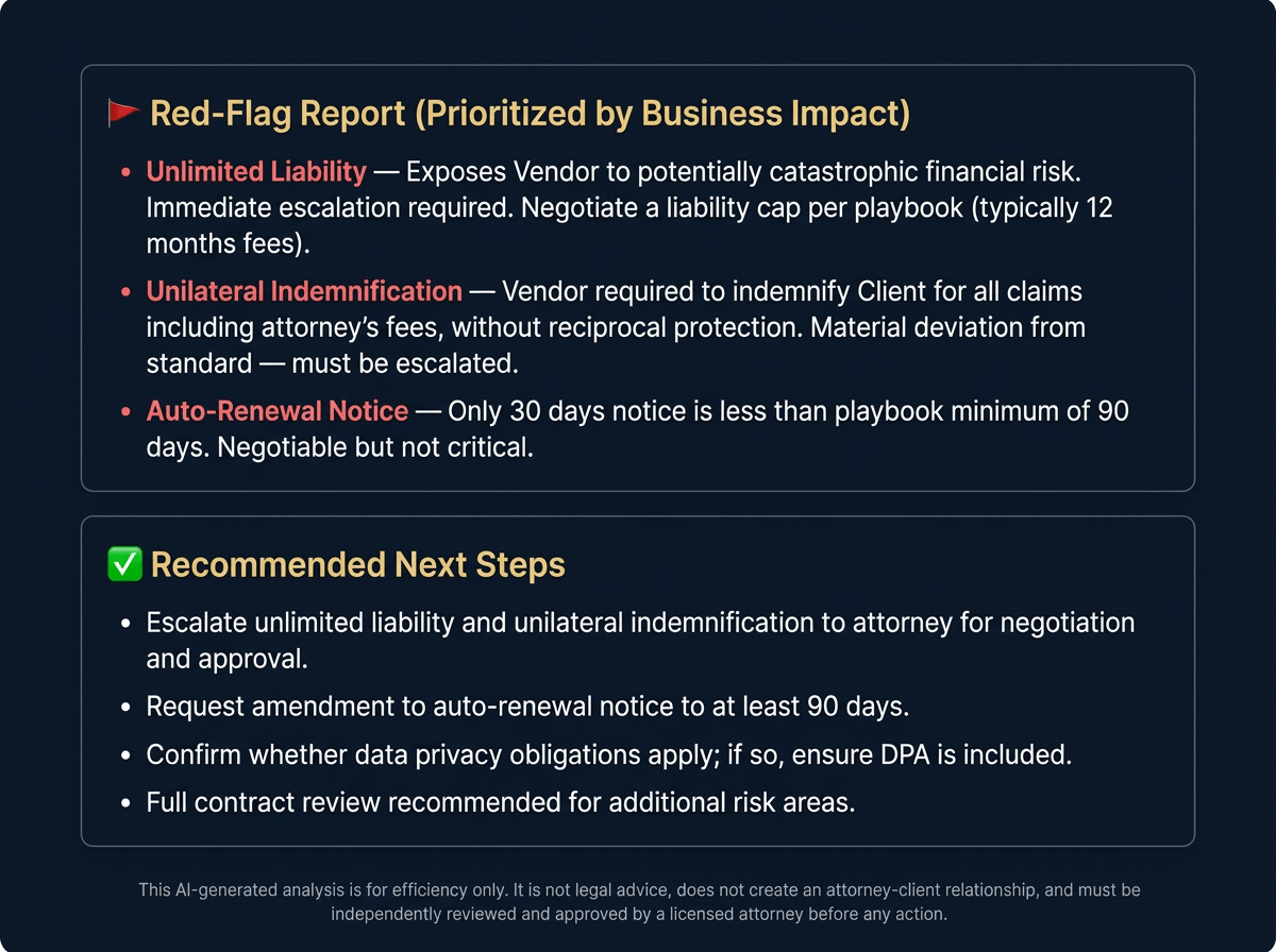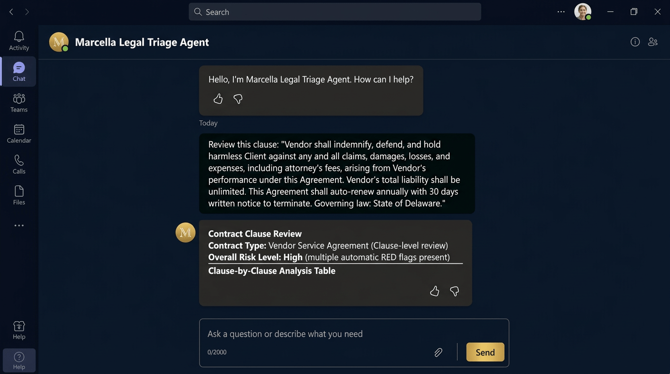 Marcella doesn’t just know “the law.” She knows your firm. She indexes your SharePoint specifically to flag when a contract deviates from your playbook, not generic standards.